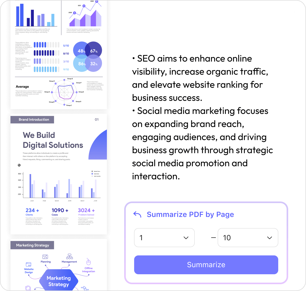 Choose how you summarize: select a specific page, define a page range, copy and paste content into the AI chatbox, or transform your document into a mind map for a structured overview.