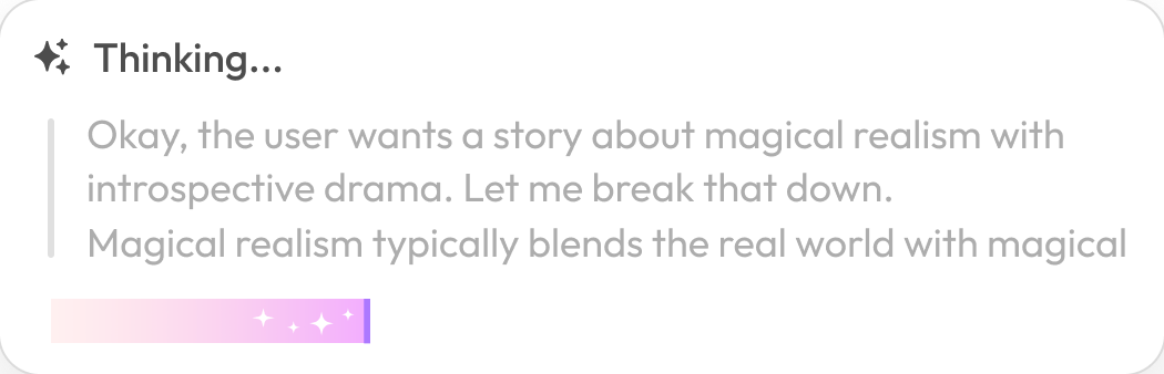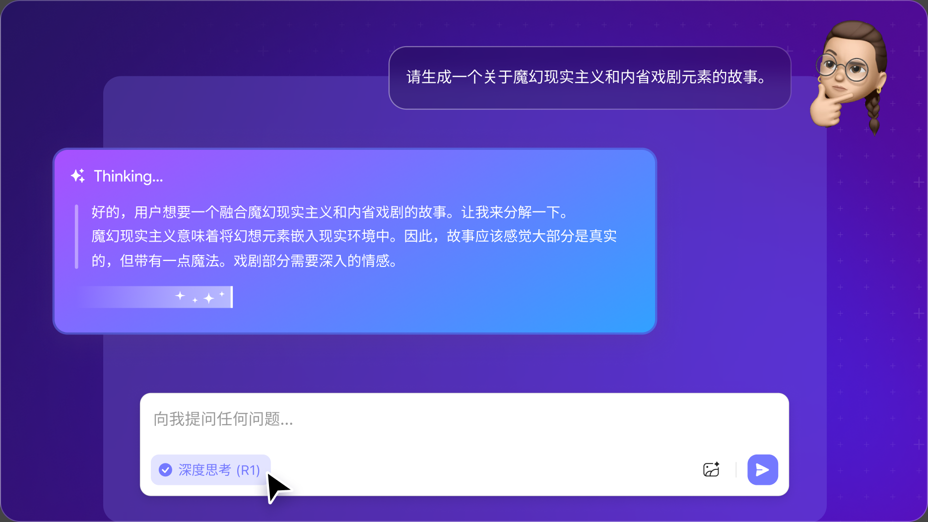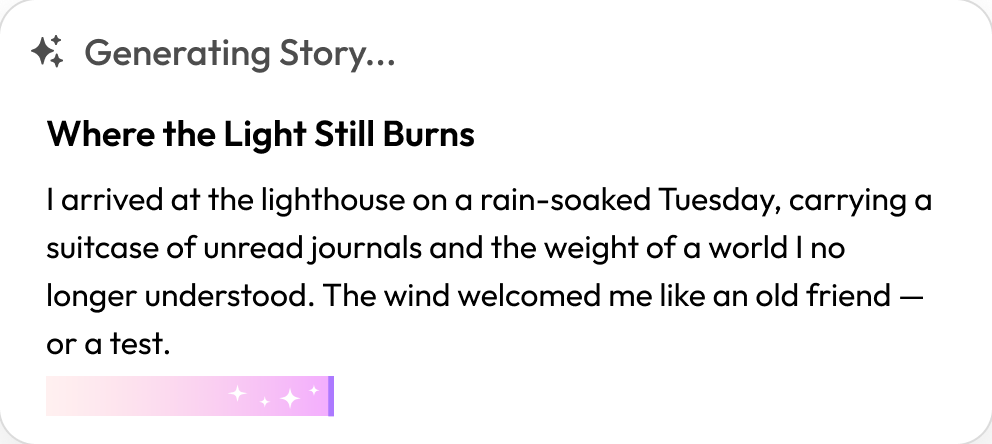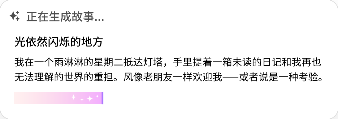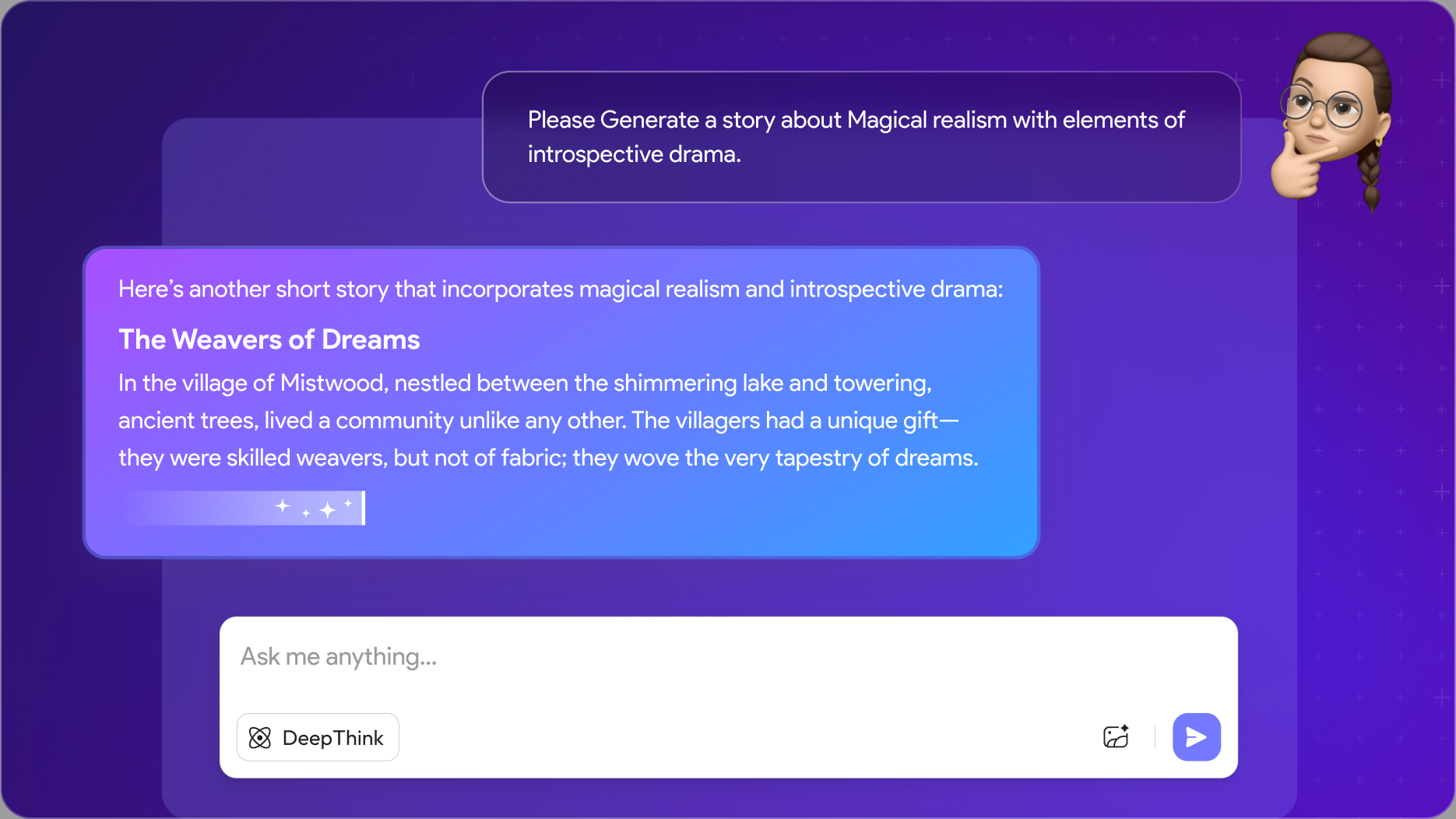 直接在提示中调整情节、类型、叙事视角、关键人物、角色名称和故事长度,个性化您的故事。您可以选择 GPT-5 模型或 DeepSeek R1 来获得不同的结果,如果您不满意,您也可以重新产生故事。我们保证能为您创作出您想要的故事。