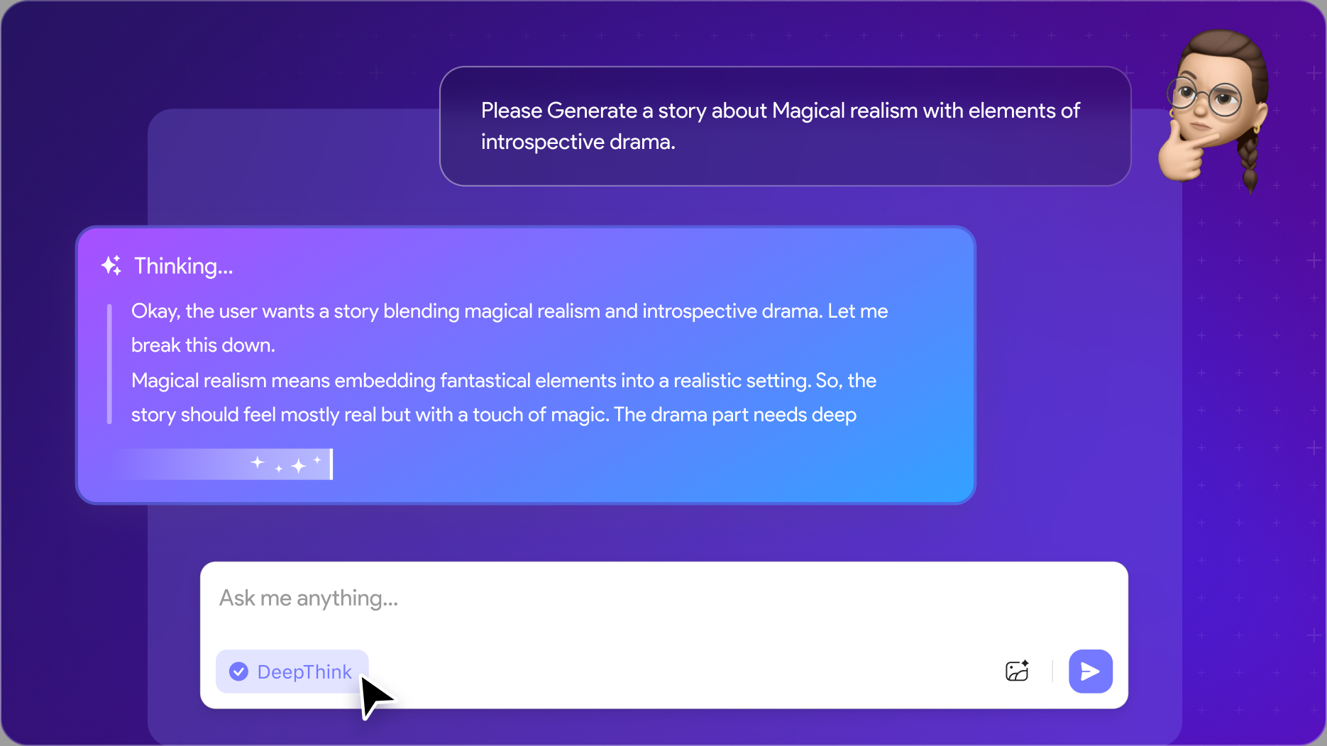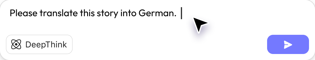 访问UPDF AI故事生成器,点击“深度思考”图标启动DeepSeek模型,输入故事创意、类型、人物等信息,然后点击“发送”即可生成故事。