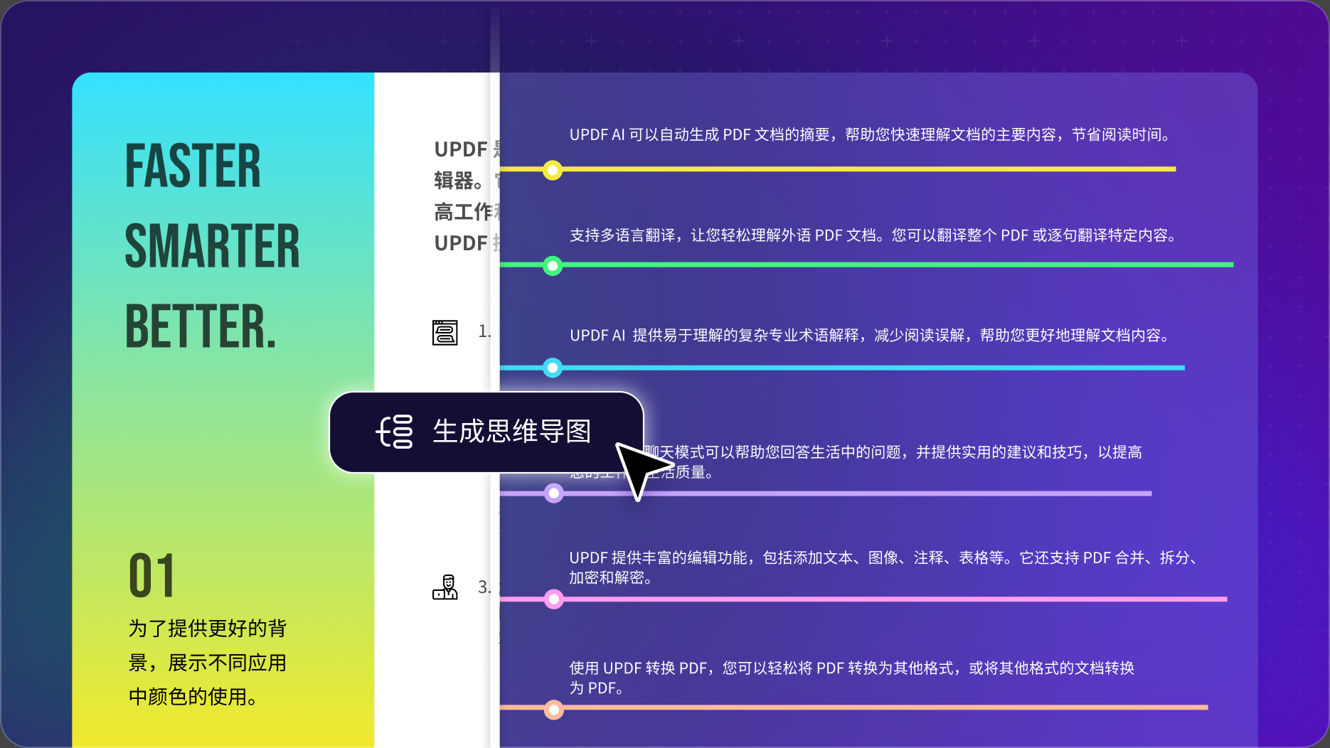 还在为冗长的研究论文或商业报告而苦恼吗?UPDF AI可立即将您的PDF转换为清晰、结构化的思维导图。一目了然地呈现关键概念和联系,非常适合学生阅读文章、法务审查合约或研究人员阅读研究报告。
